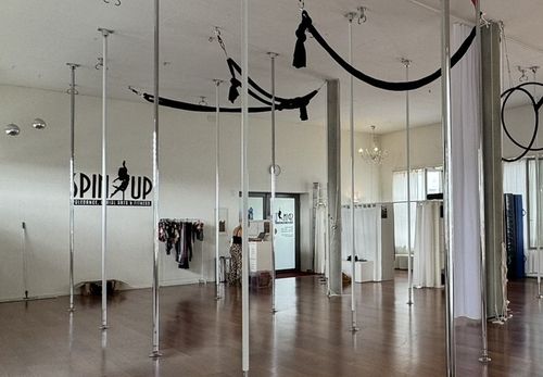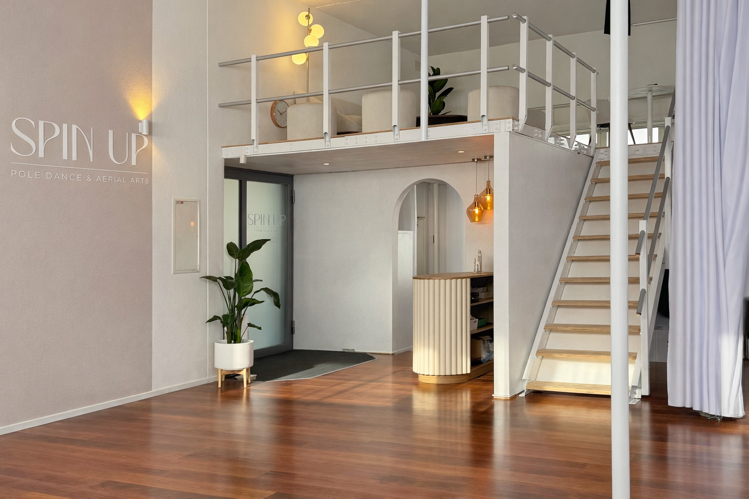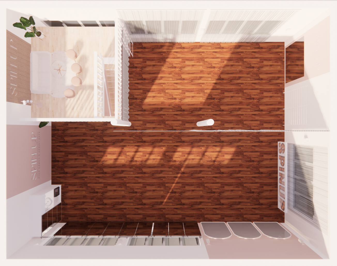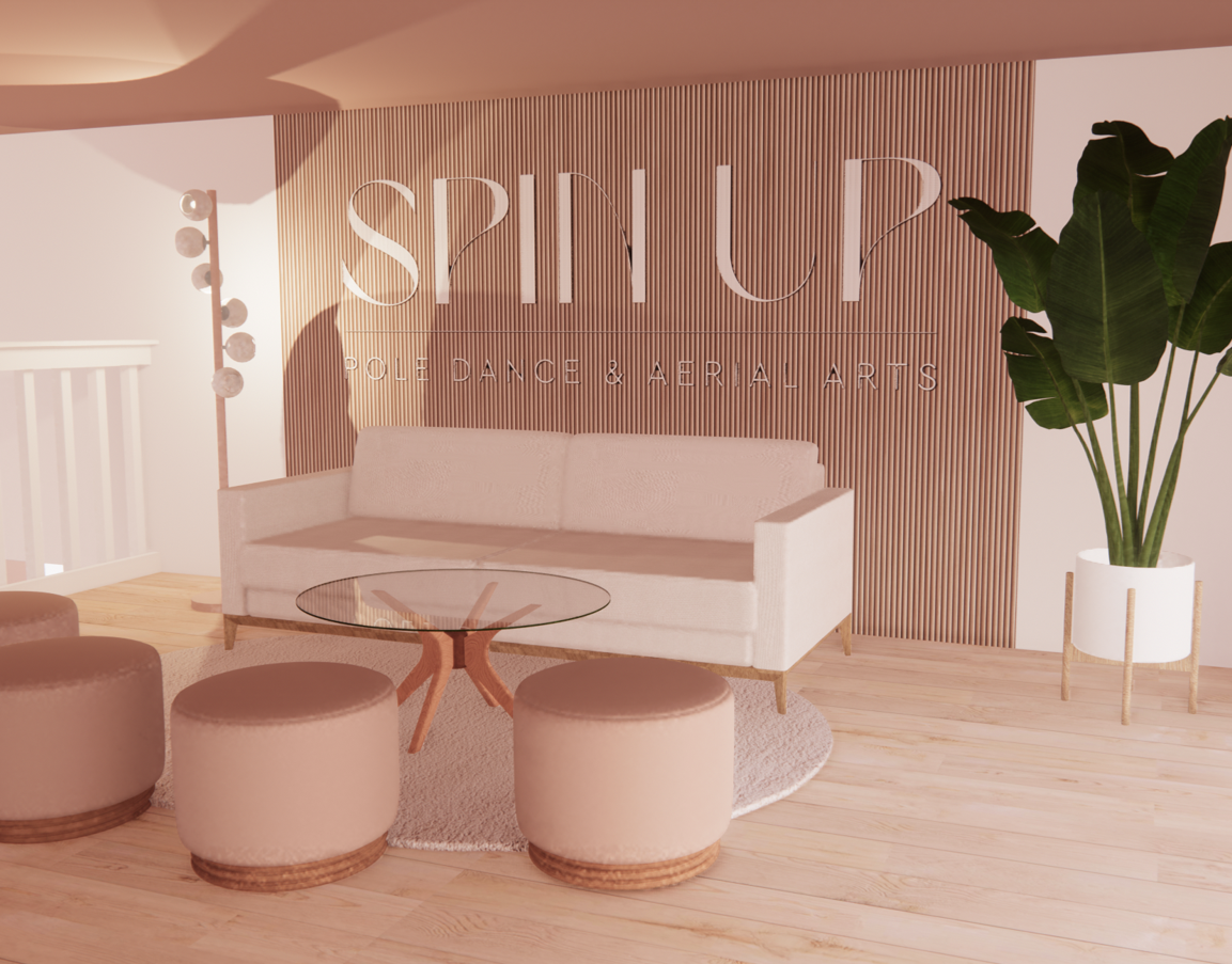 Complete redesign of a long-standing pole dance and aerial arts studio to enable simultaneous training in two areas, refine functionality, and embody SpinUp’s evolving brand identity.