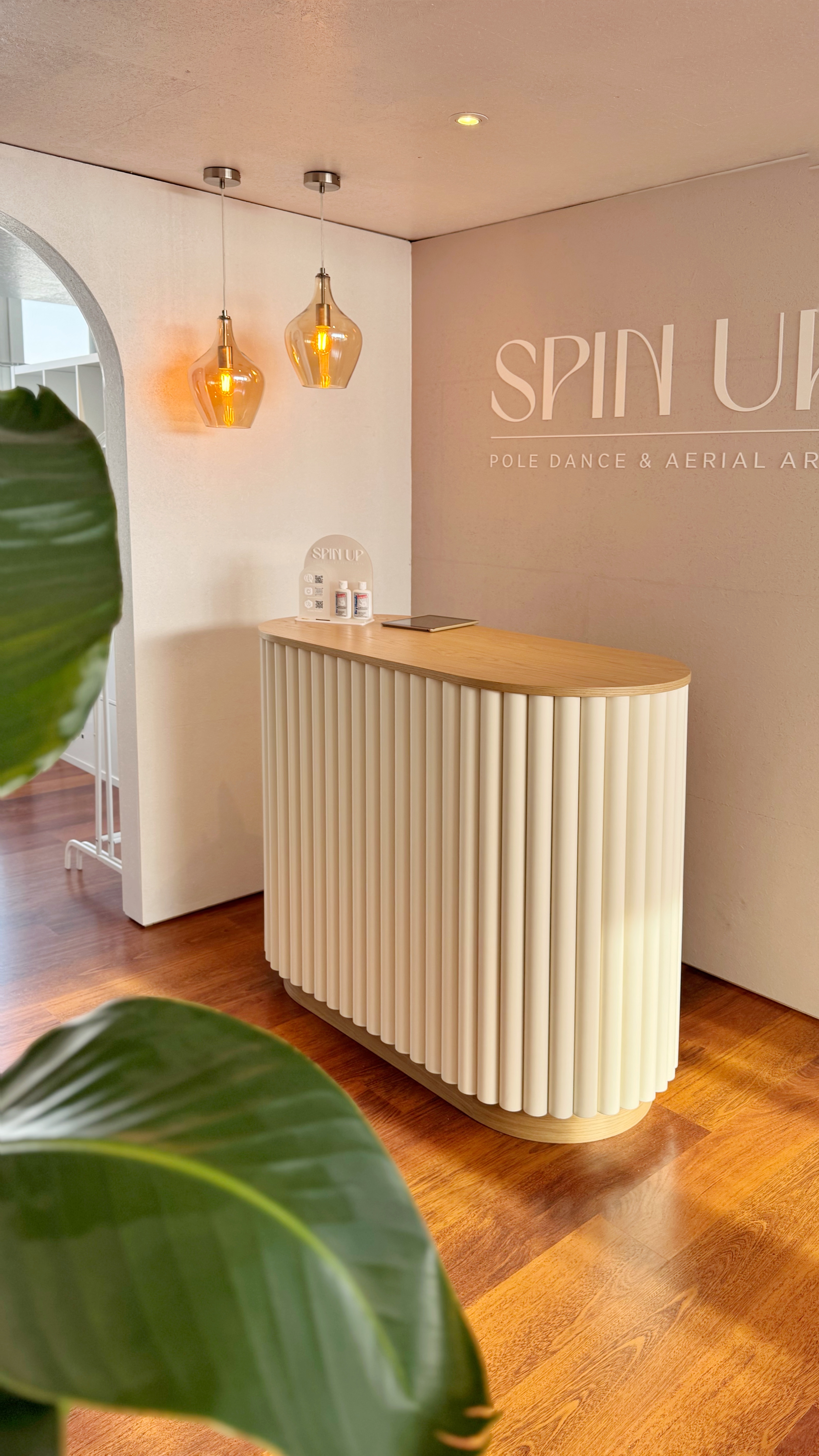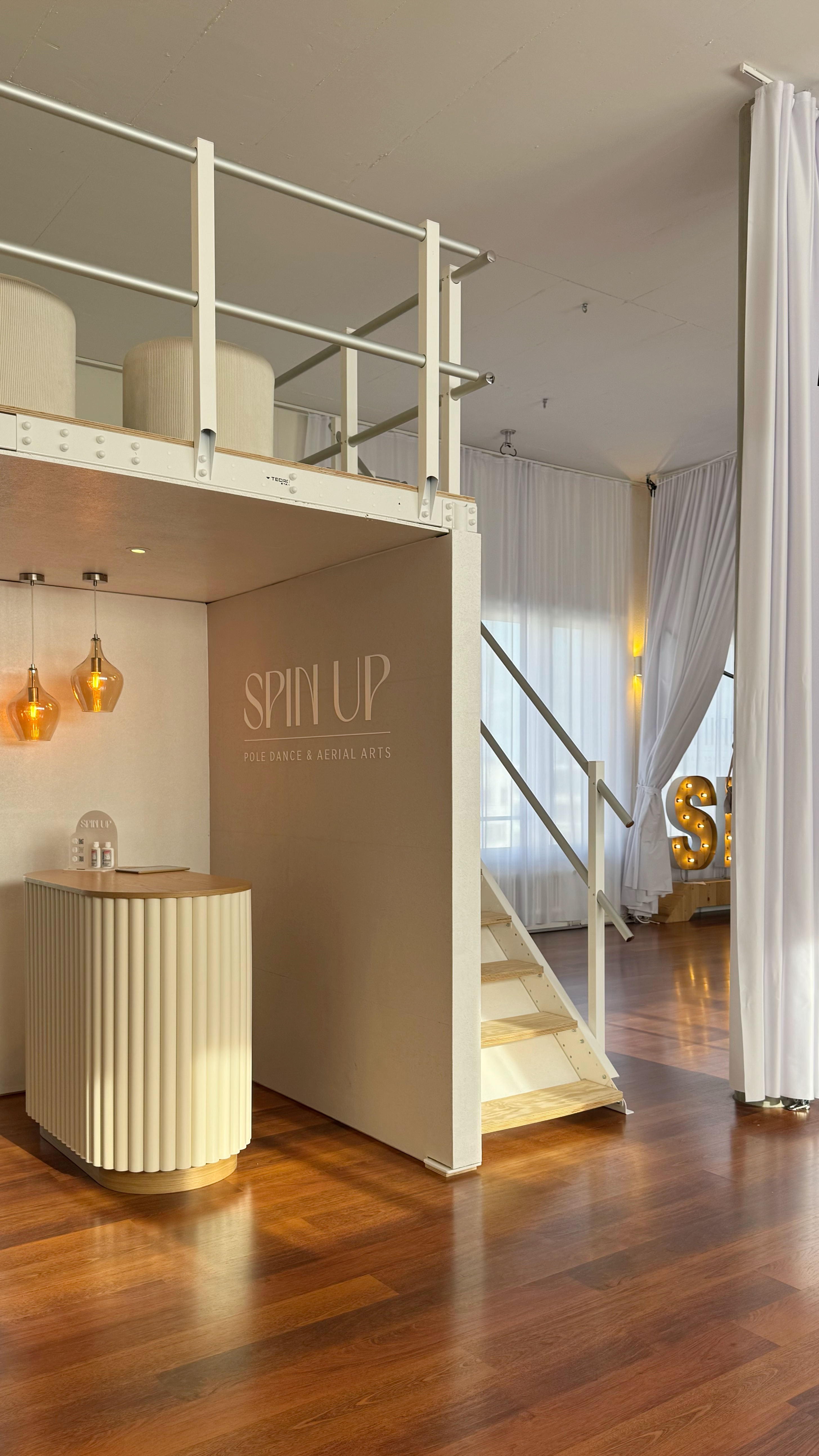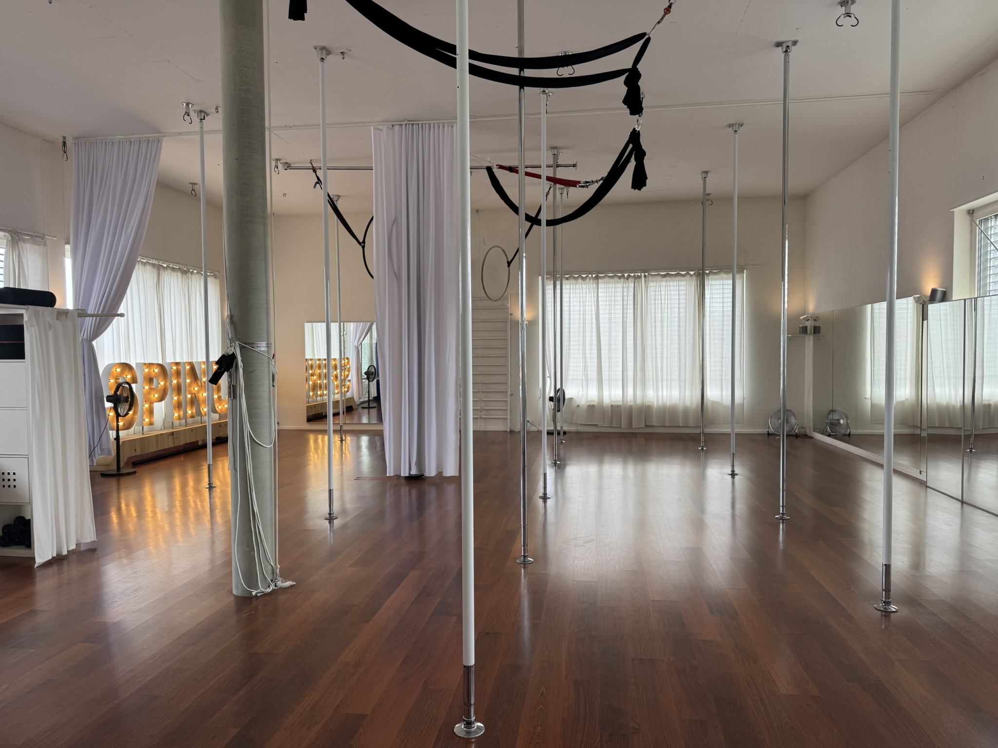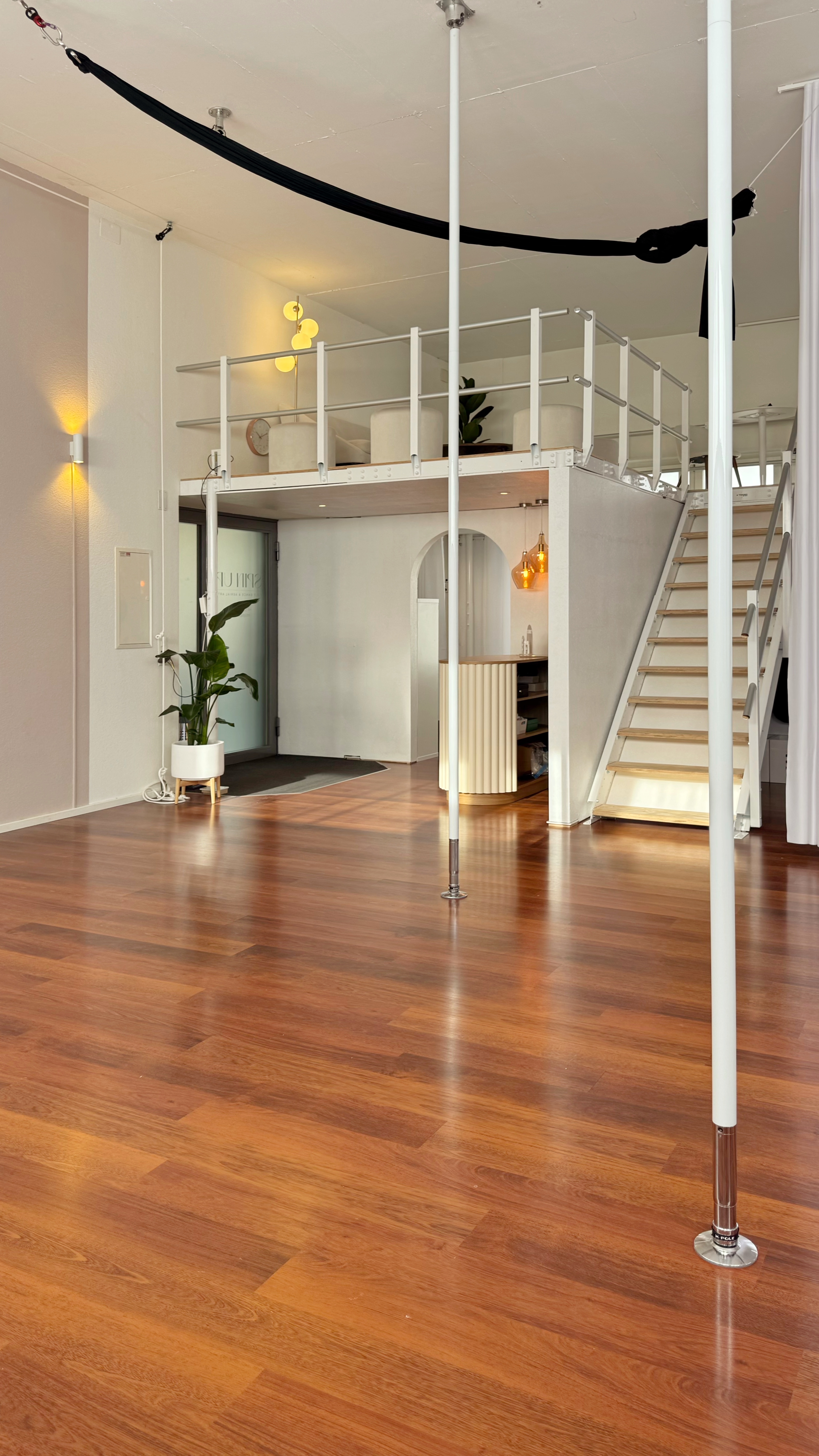 Complete redesign of a long-standing pole dance and aerial arts studio to enable simultaneous training in two areas, refine functionality, and embody SpinUp’s evolving brand identity.